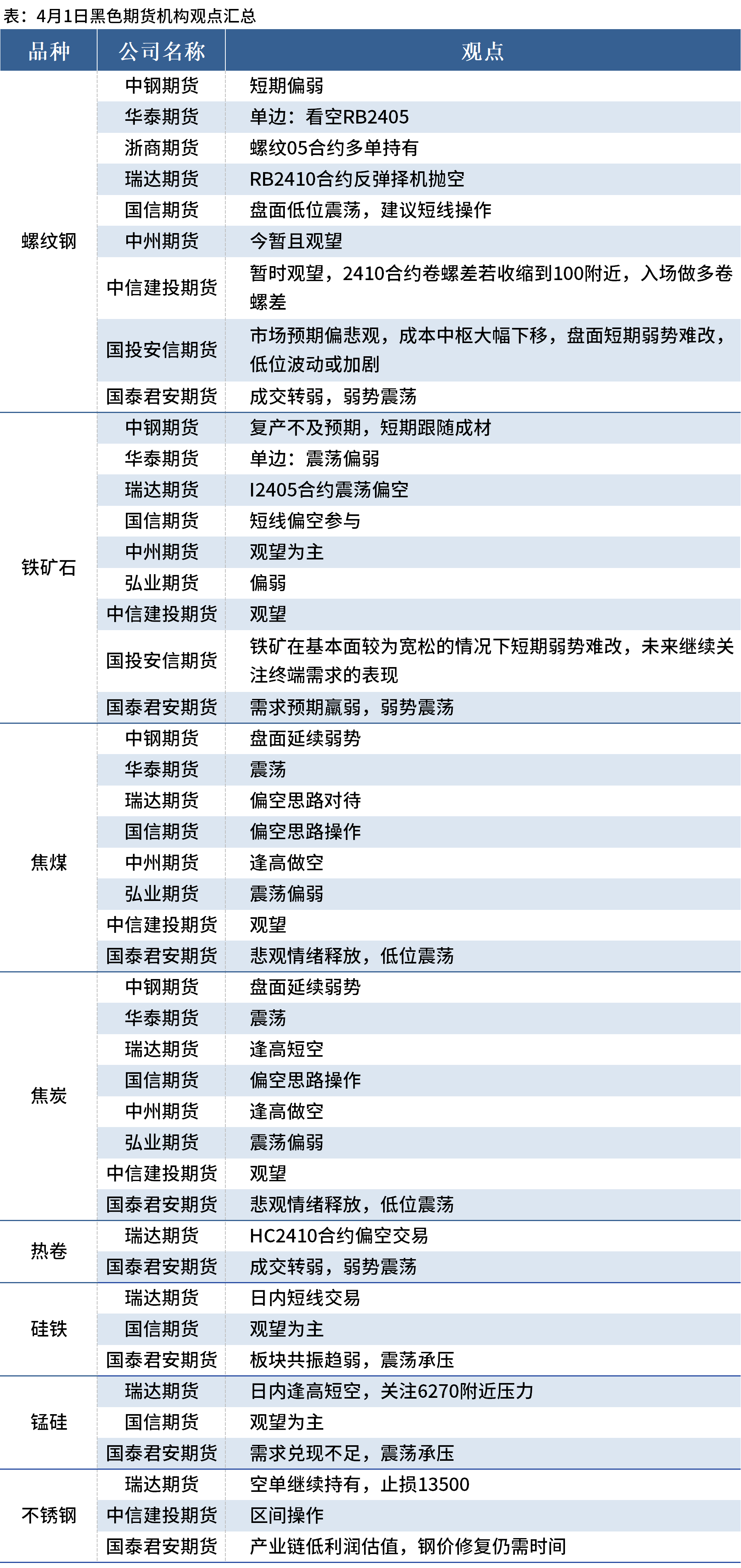 据Mysteel统计4月1日10家期货机构操作策略,其中多数机构料螺纹钢震荡偏弱,铁矿石震荡偏弱,焦煤、焦炭震荡偏弱。具体汇总内容如下:
