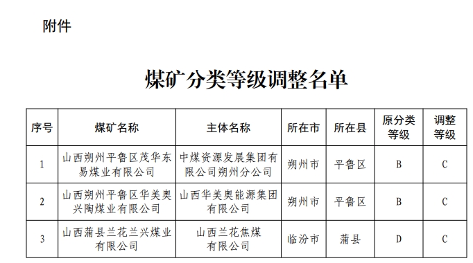 2024年3月份接到朔州、临汾两市3座煤矿关于调整煤矿分类等级的报告,按照《山西省人民政府办公厅关于印发山西省煤矿分级分类安全监管监察办法的通知》(晋政办发〔2020〕22号)第九条第二款和有关分类标准规定,经审核,同意山西朔州平鲁区茂华东易煤业有限公司等2 座煤矿由B 类调整为C类,山西蒲县兰花兰兴煤业有限公司由D 类调整为C 类。现将调整后煤矿分类名单进行公告,各级煤矿安全监管监察部门按照调整后的类别实施监管监察工作。其他煤矿分类等级仍按《山西省安全生产委员会办公室关于公布 2024 年度煤矿分类名单的通知》(晋安办发〔2024〕7 号)执行。