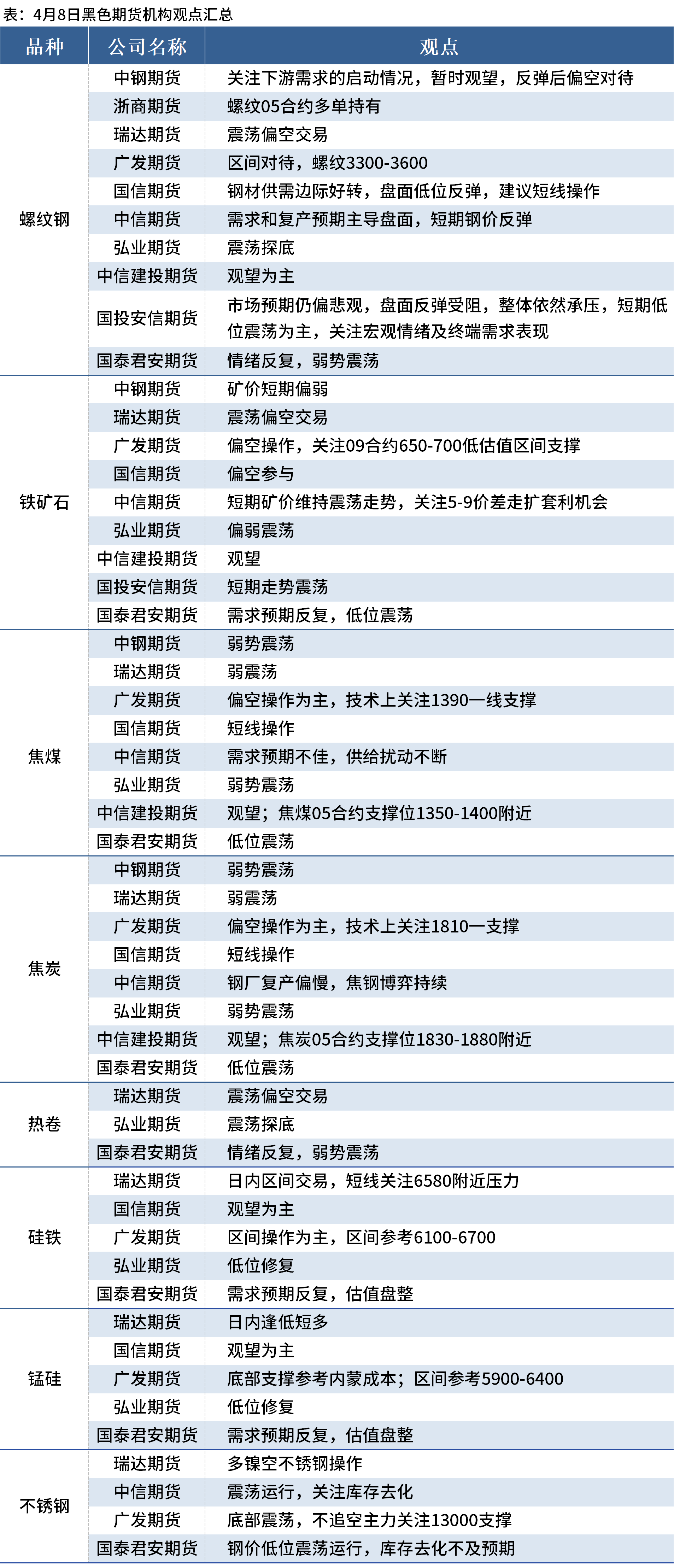 据Mysteel统计4月8日10家期货机构操作策略,其中多数机构料螺纹钢震荡运行,铁矿石震荡偏弱,焦煤、焦炭弱势震荡。具体汇总内容如下: