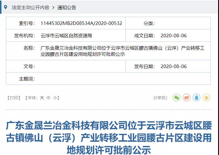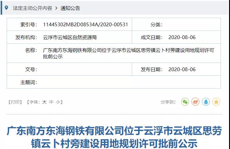 日前,广东省云浮市云城区自然资源局网站先后公布了广东南方东海钢铁有限公司、广东金晟兰冶金科技有限公司于广东省金属智造科技产业园内的两大钢铁项目建设用地规划许可批前公示。