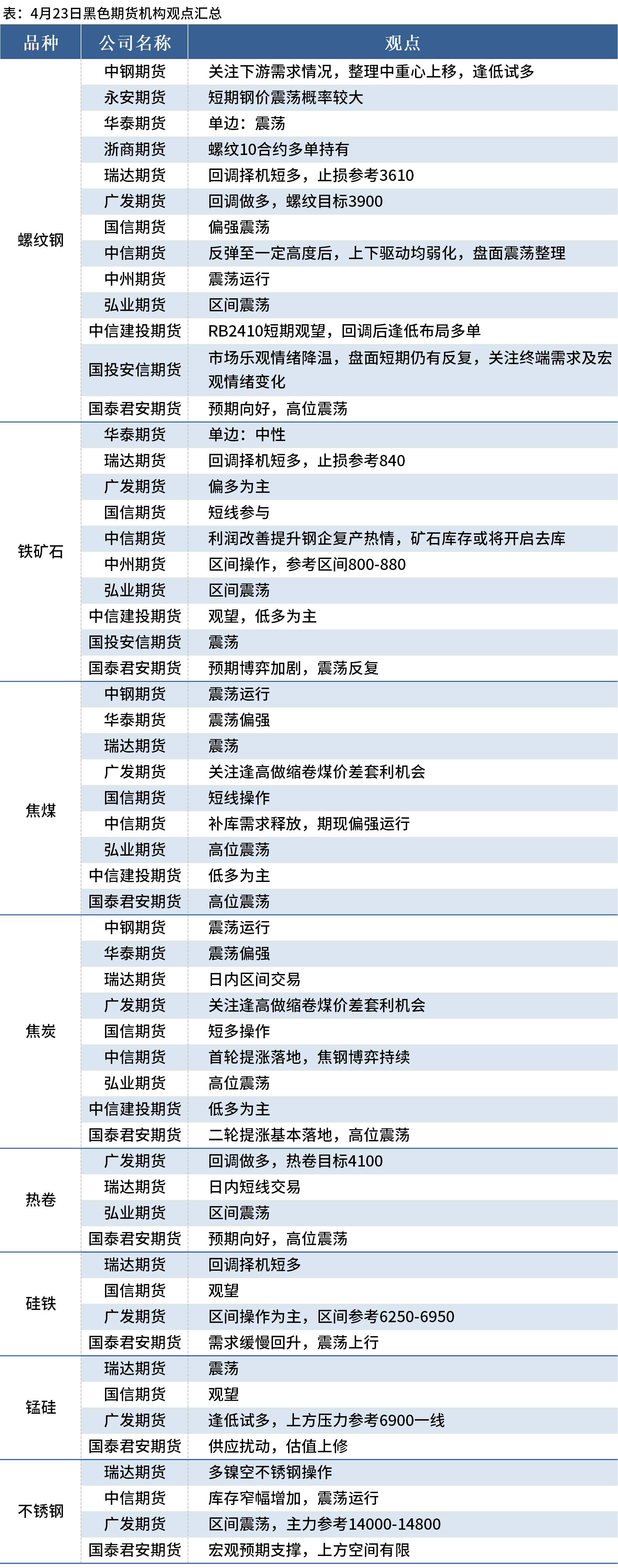 据Mysteel统计4月23日13家期货机构操作策略,其中多数机构料螺纹钢震荡运行,铁矿石震荡运行,焦煤、焦炭震荡运行。具体汇总内容如下: