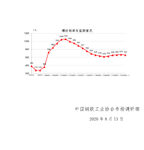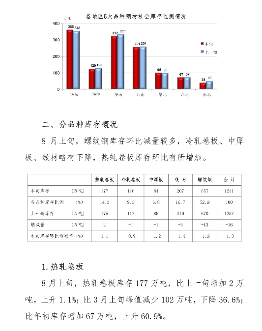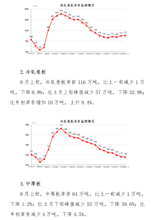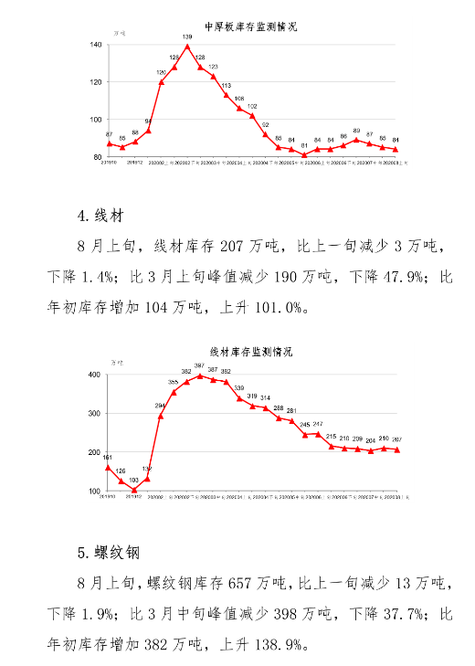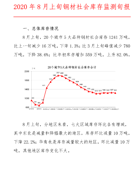 中钢协数据显示,8月上旬,20个城市5大品种钢材社会库存1241万吨,比上一旬减少16万吨,下降1.3%;比3月上旬峰值减少780万吨,下降38.6%;比年初库存增加559万吨,上升82.0%。