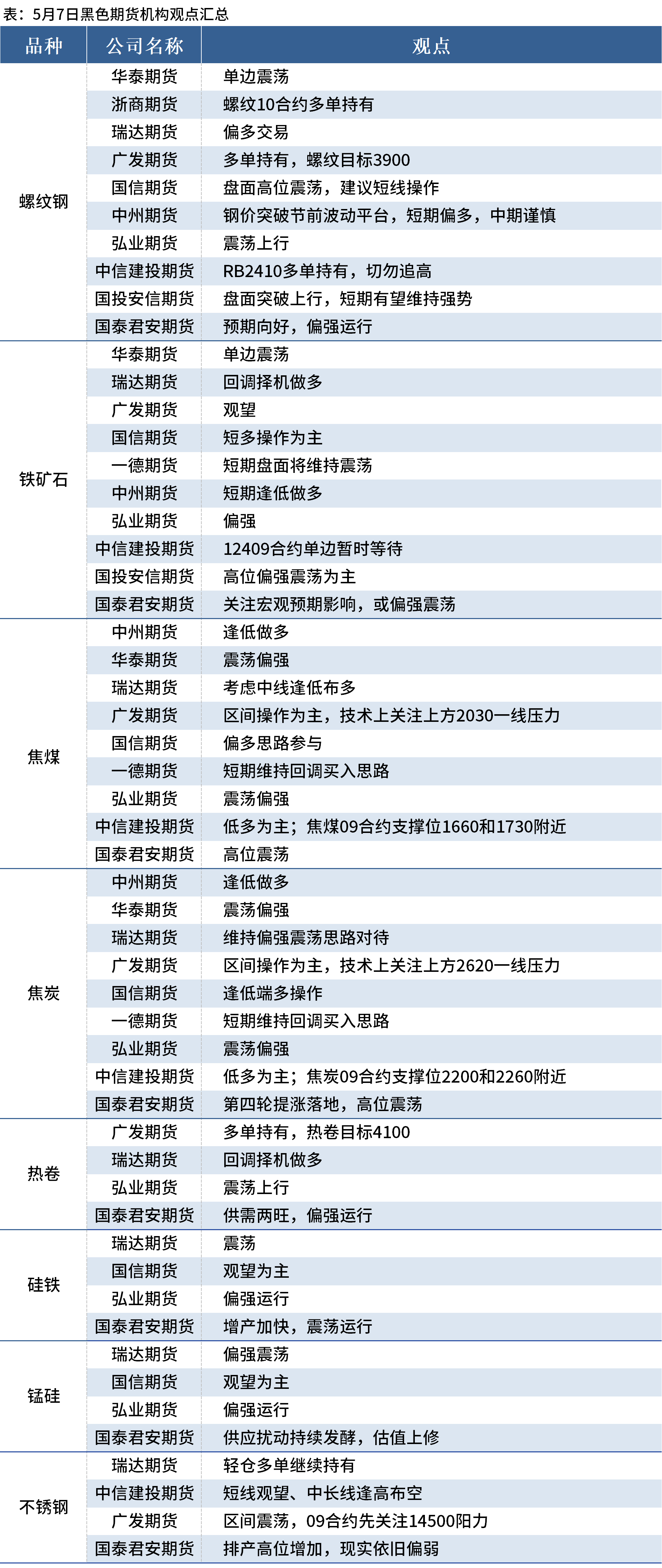 Mysteel统计5月7日11家期货机构操作策略,其中多数机构看涨螺纹钢,铁矿石震荡偏强,焦煤、焦炭震荡偏强。具体汇总内容如下:
