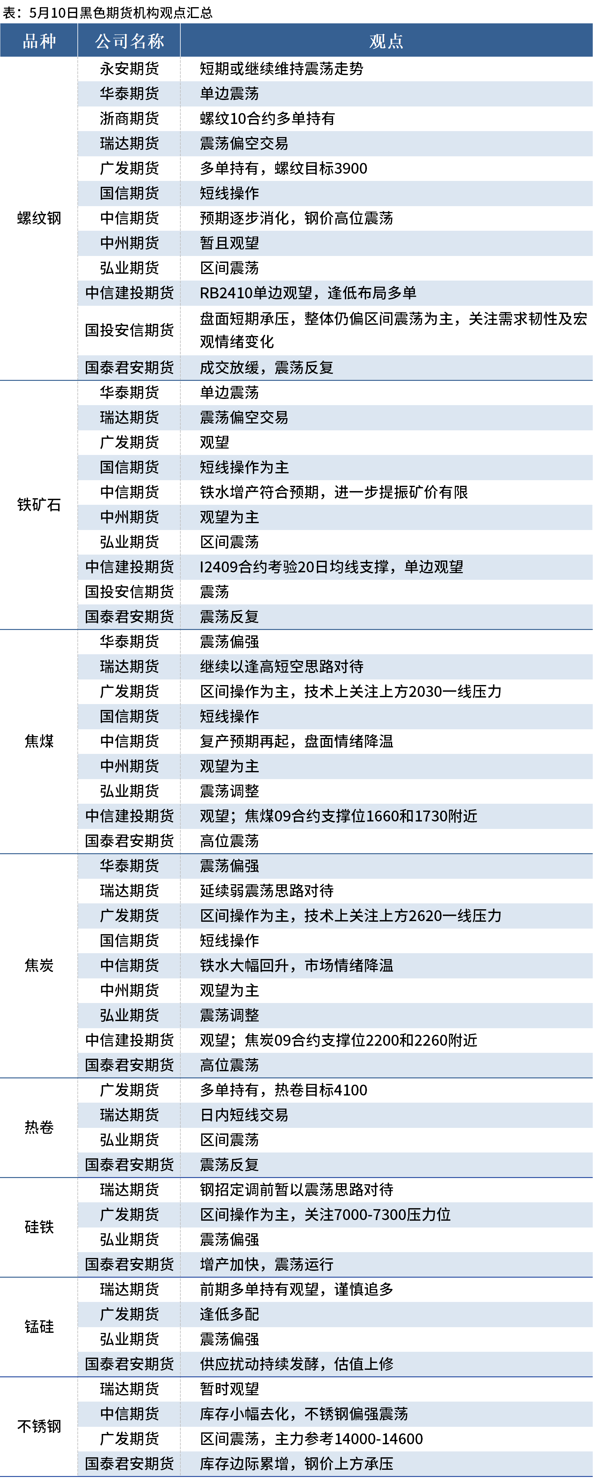 据Mysteel统计5月10日12家期货机构操作策略,其中多数机构料螺纹钢震荡运行,铁矿石震荡运行,焦煤、焦炭震荡运行。具体汇总内容如下: