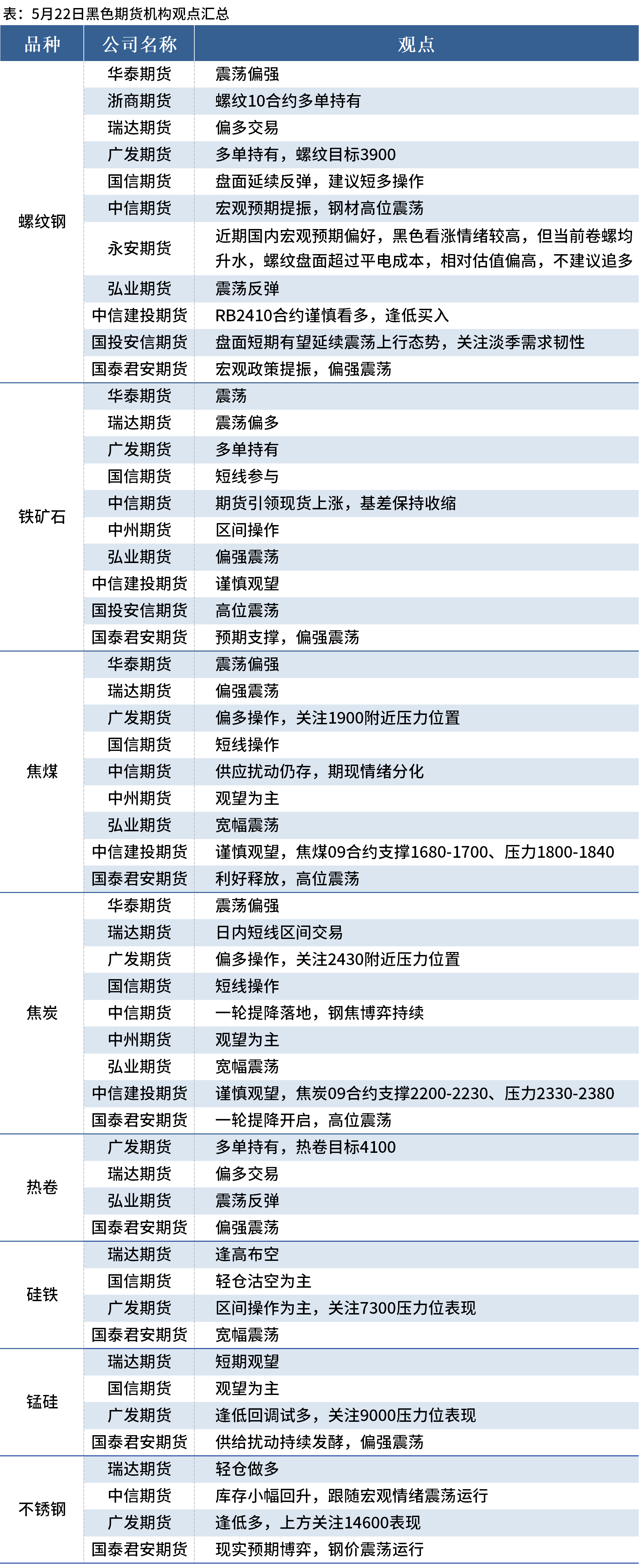 据Mysteel统计5月22日12家期货机构操作策略,其中多数机构料螺纹钢震荡偏强,铁矿石震荡偏强,焦煤、焦炭震荡运行。具体汇总内容如下: