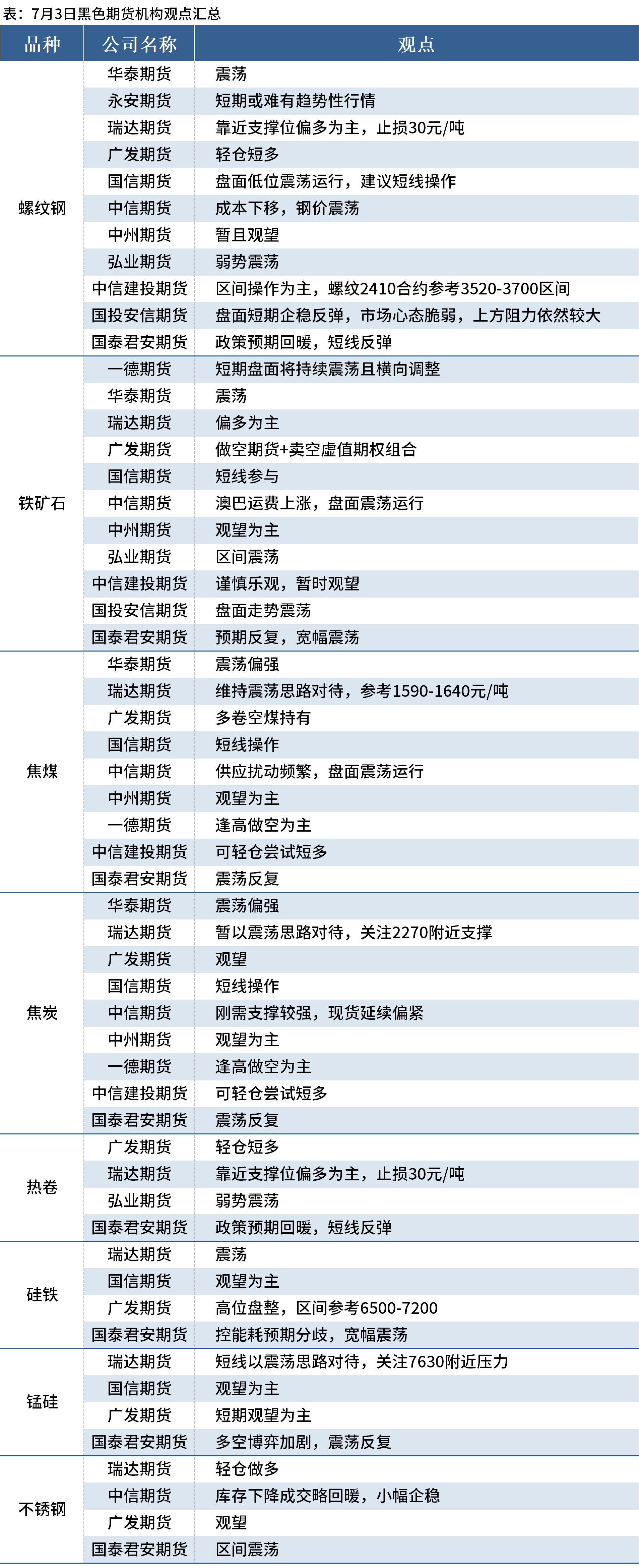 据Mysteel统计7月3日11家期货机构操作策略,其中多数机构料螺纹钢震荡运行,铁矿石震荡运行,焦煤、焦炭震荡运行。具体汇总内容如下: