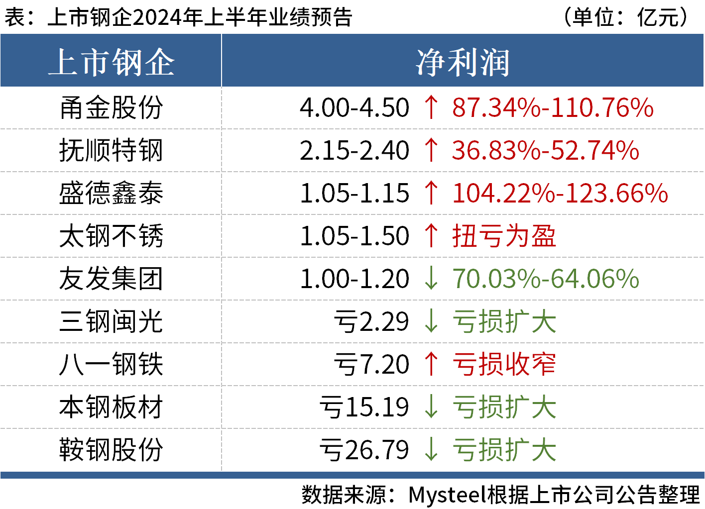 据Mysteel不完全统计,截至7月10日,已有9家上市钢企公布2024年上半年业绩预告。其中,甬金股份、抚顺特钢、盛德鑫泰、太钢不锈和友发集团实现盈利。具体如下: