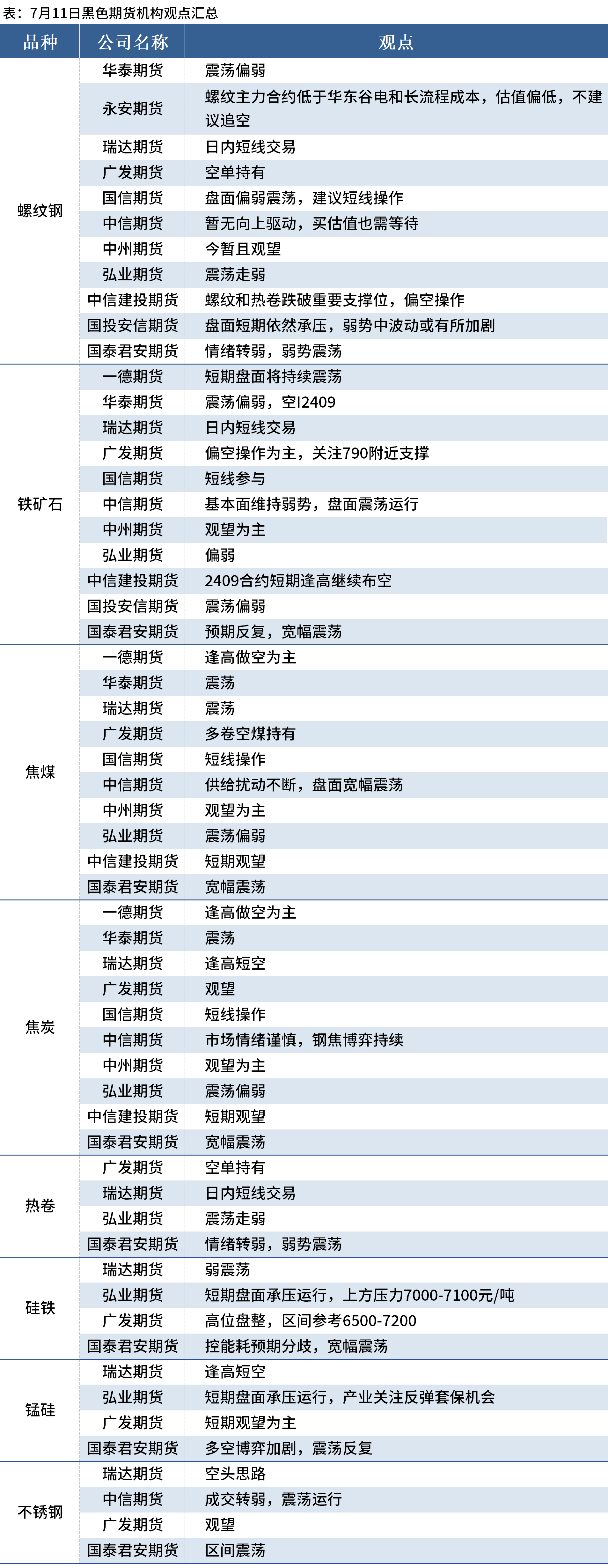 据Mysteel统计7月11日11家期货机构操作策略,其中多数机构料螺纹钢震荡偏弱,铁矿石震荡偏弱,焦煤、焦炭震荡运行。具体汇总内容如下: