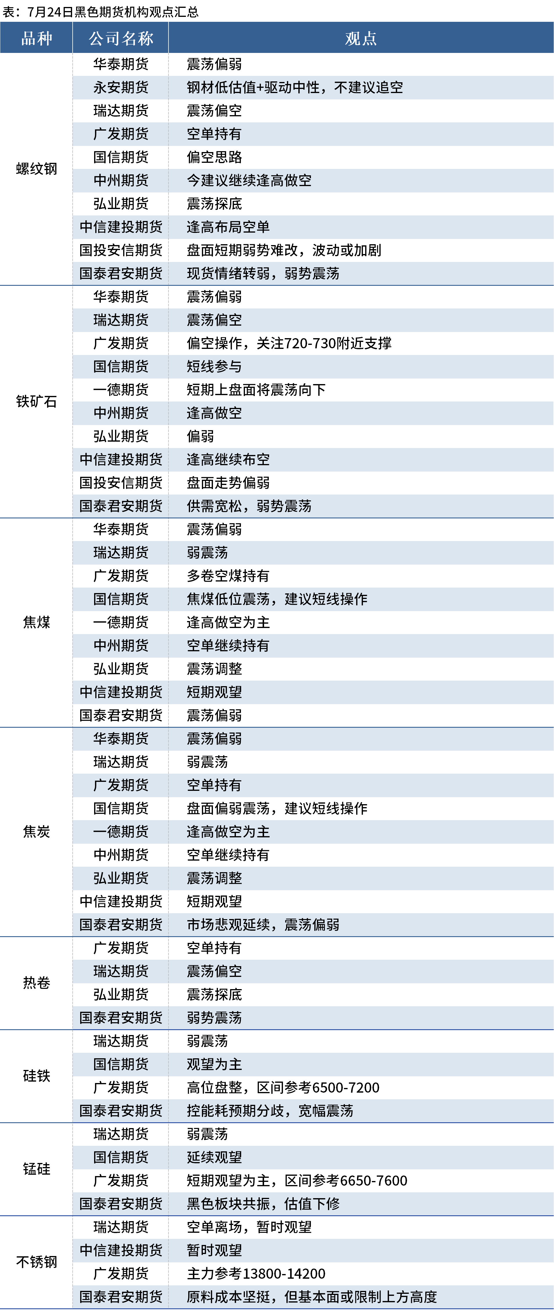 Mysteel统计7月24日11家期货机构操作策略,其中多数机构料螺纹钢弱势震荡,铁矿石震荡偏弱,焦煤、焦炭震荡偏弱。具体汇总内容如下:
