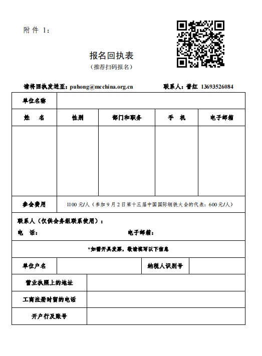 请参会代表于8月28日之前扫描二维码注册报名或将报名回执表(见附件1)填妥后发至会务组。会议费标准为:1100元/人,会议费含代表餐费、会议资料费及会场、背板搭建等费用。