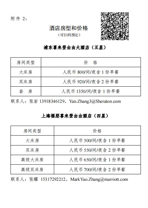会务组以较优惠价格在会议举办酒店预留了部分客房,参会企业代表可直接报本次会议名称进行预订,数量有限,先到先得。酒店房型和价格见附件2,敬请尽早与酒店联系,住宿费用自理,直接与酒店结算。住宿接待酒店联系方式如下: