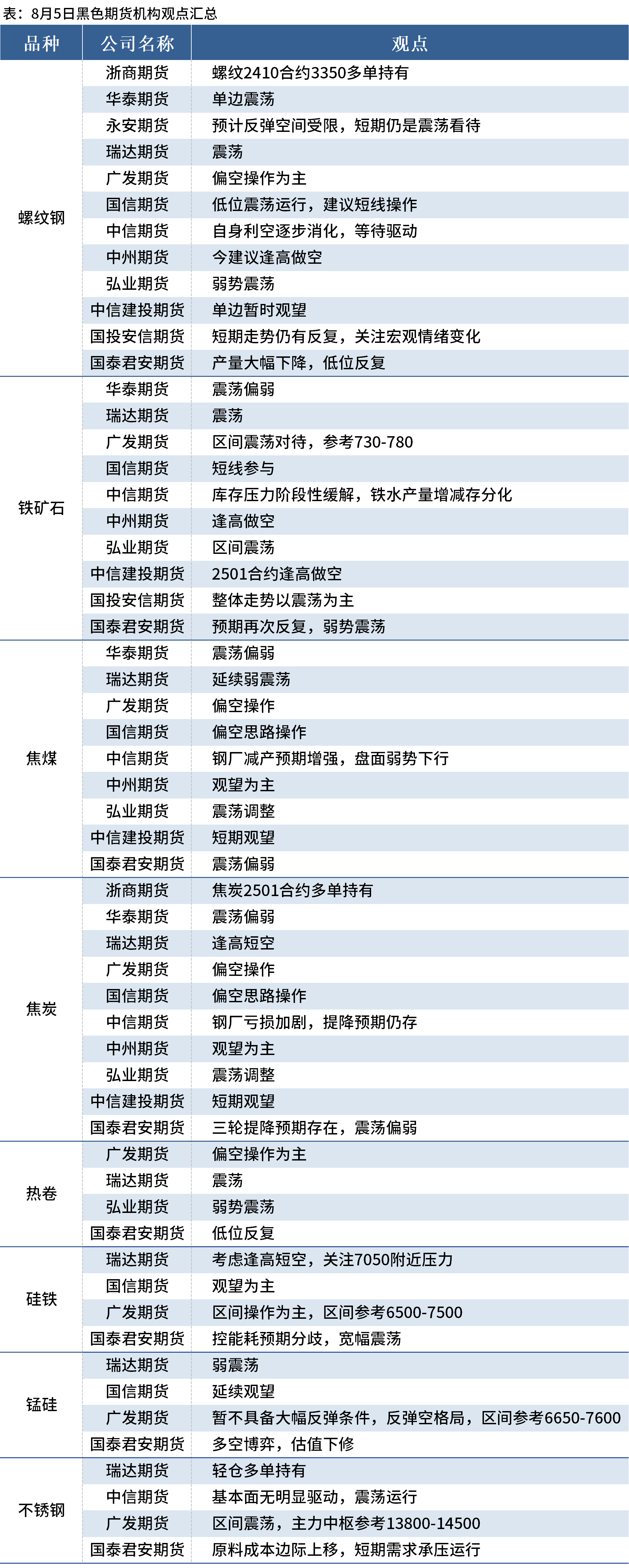 据Mysteel统计8月5日12家期货机构操作策略,其中多数机构料螺纹钢震荡运行,铁矿石震荡运行,焦煤、焦炭震荡偏弱。具体汇总内容如下: