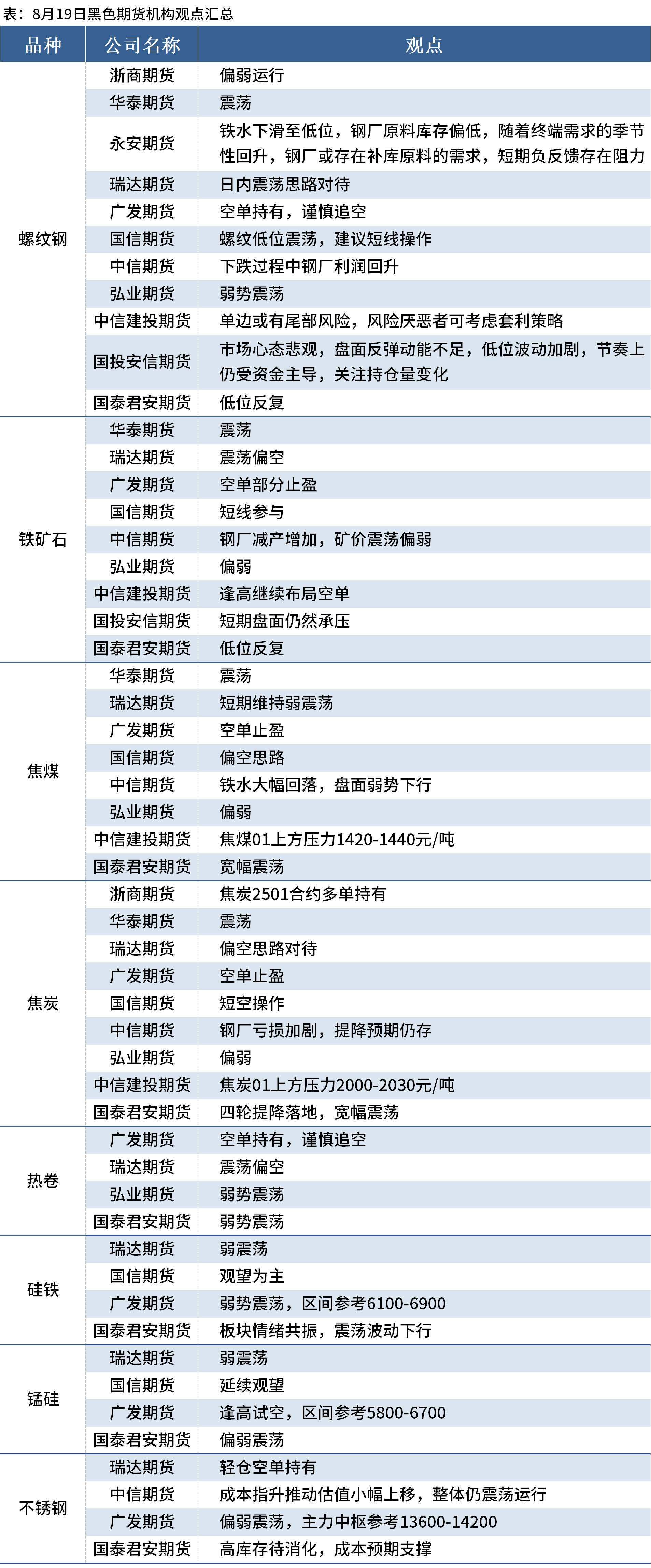 据Mysteel统计8月19日11家期货机构操作策略,其中多数机构料螺纹钢弱势震荡,铁矿石震荡运行,焦煤、焦炭弱势震荡。具体汇总内容如下:
