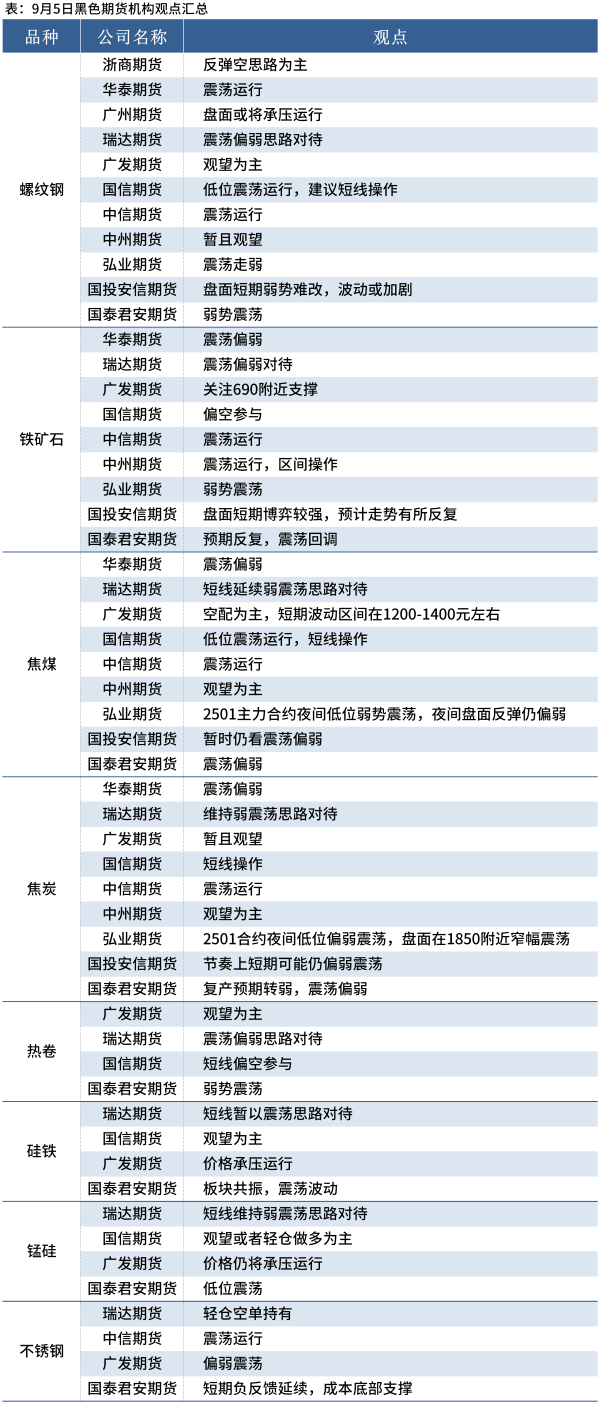据Mysteel统计9月5日11家期货机构操作策略,其中多数机构料螺纹钢震荡走弱,铁矿石震荡偏弱,焦煤、焦炭震荡偏弱。具体汇总内容如下: