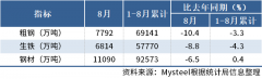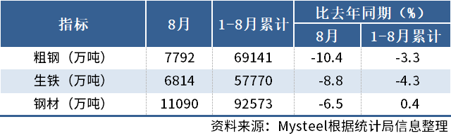 1-8月,中国粗钢产量69141万吨,同比下降3.3%;生铁产量57770万吨,同比下降4.3%;钢材产量92573万吨,同比增长0.4%。