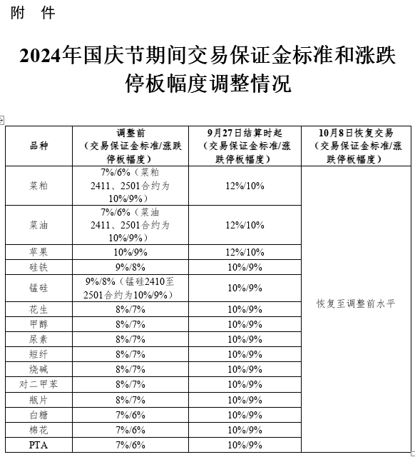 一、自2024年9月27日结算时起,菜粕、菜油和苹果期货合约的交易保证金标准为12%,涨跌停板幅度为10%;白糖、棉花、花生、PTA、甲醇、硅铁、锰硅、尿素、短纤、烧碱、对二甲苯和瓶片期货合约的交易保证金标准为10%,涨跌停板幅度为9%。