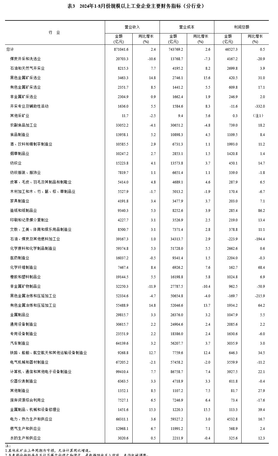 1—8月份,全国规模以上工业企业实现利润总额46527.3亿元,同比增长0.5%。