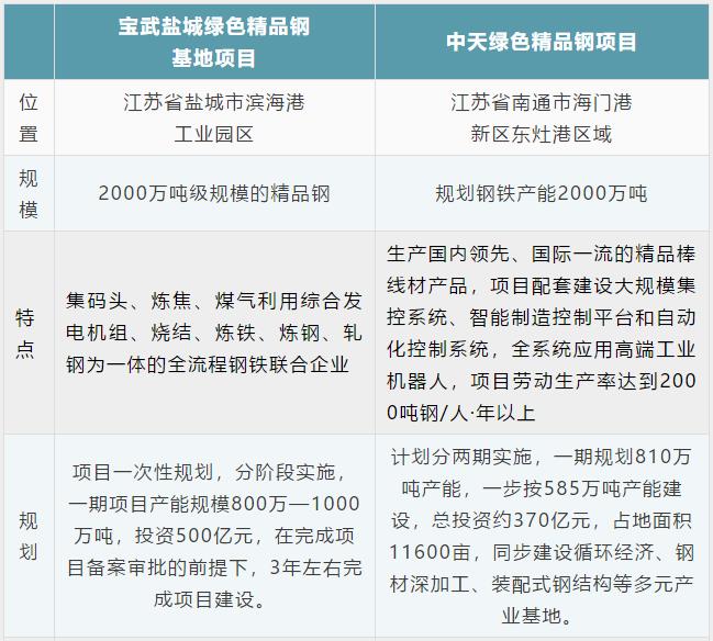据《中国冶金报》、中国钢铁新闻网之前报道,江苏省钢铁行业沿江沿海协调发展新格局应包括2000万吨级规模的宝武盐城绿色精品钢基地项目和2000万吨级规模的中天绿色精品钢项目。