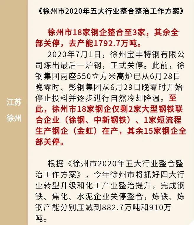 一是严控沿江地区。推动减量调整,严格控制沿江地区的钢铁产能,同步推动做精做优和战略转移。二是倒逼环太湖地区。综合运用政策执法手段,倒逼环太湖等环境敏感地区产能向沿海转移。三是整合徐州等地区(最新情况见下图)。重点整合200万吨规模以下、能耗排放大的分散弱小低端产能向牵头企业集中。四是发展沿海港区。借助沿海相关港区的码头航道、集疏运体系、土地承载和环境容量等区位优势和资源禀赋,高起点、高标准地承接省内产能转移。五是提升行业发展水平。通过本轮调整,力促江苏省钢铁行业在产品结构调整、空间布局优化、安全环保提升和智能化改造等方面得到大幅提升。