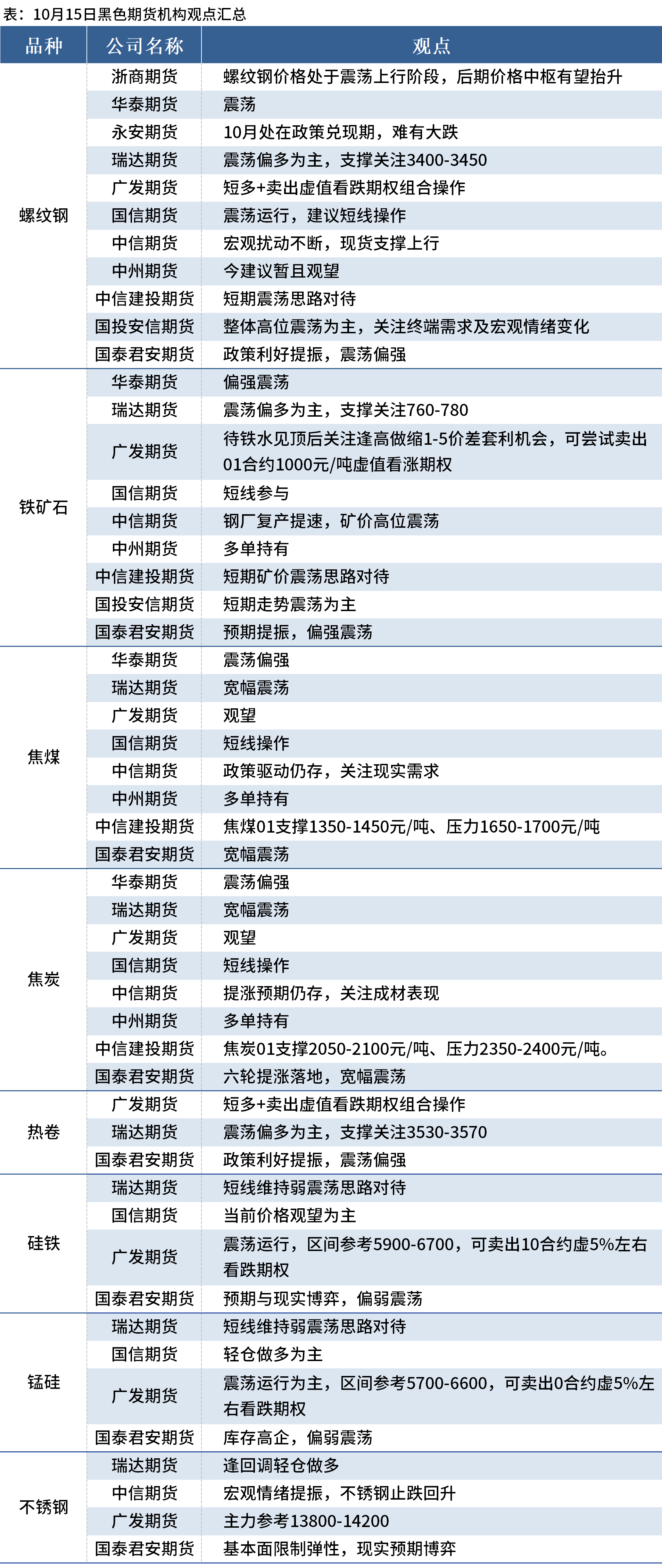 据Mysteel统计10月15日11家期货机构操作策略,其中多数机构料螺纹钢震荡运行,铁矿石偏强震荡,焦煤、焦炭震荡运行。具体汇总内容如下:
