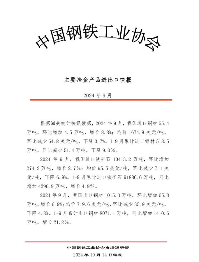 2024年9月钢铁产品进出口快报
