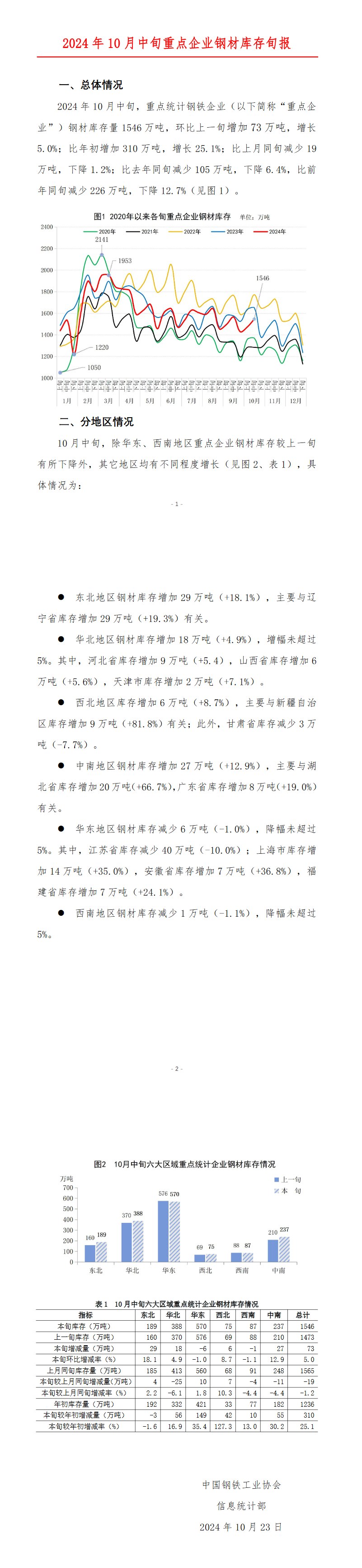2024年10月中旬,重点统计钢铁企业钢材库存量1546万吨,环比上一旬增加73万吨,增长5.0%;比年初增加310万吨,增长25.1%;比上月同旬减少19万吨,下降1.2%;比去年同旬减少105万吨,下降6.4%,比前年同旬减少226万吨,下降12.7%。