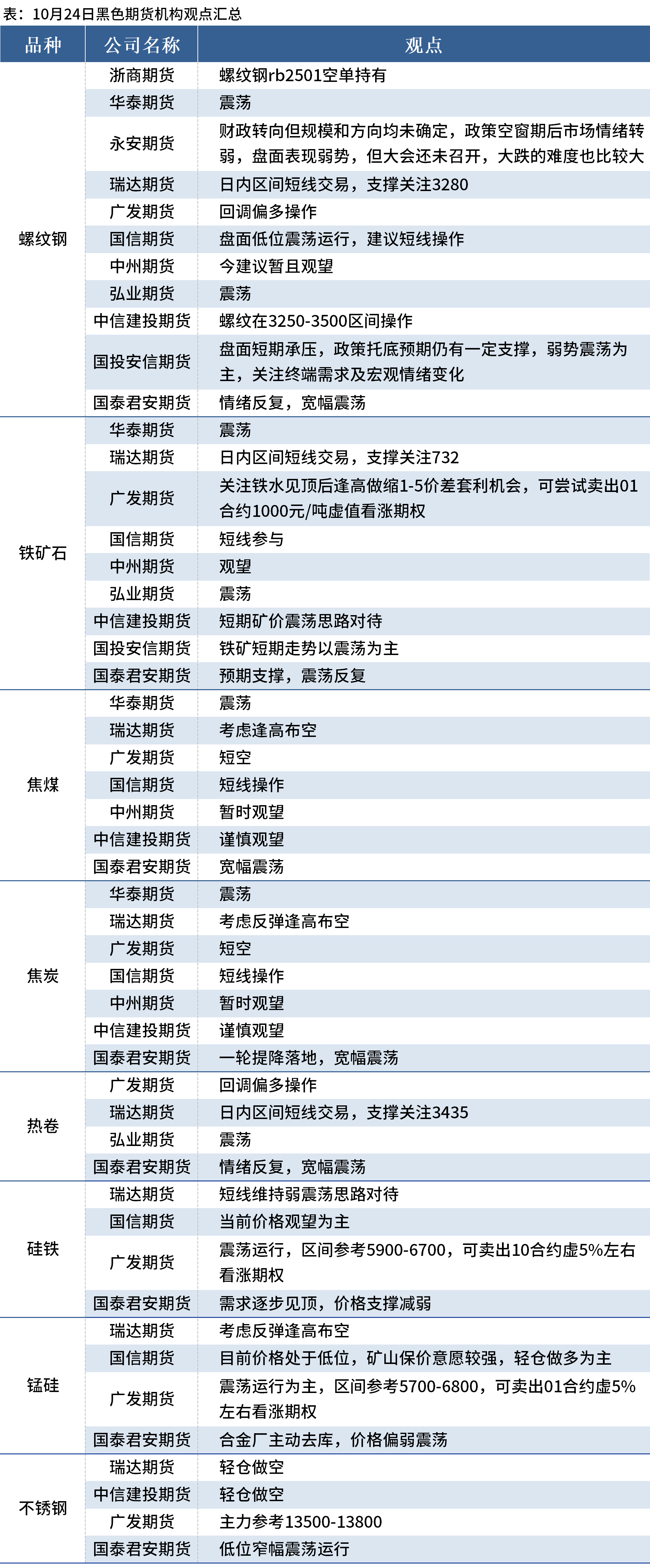 据Mysteel统计10月24日12家期货机构操作策略,其中多数机构料螺纹钢震荡运行,铁矿石震荡运行,焦煤、焦炭震荡运行。具体汇总内容如下: