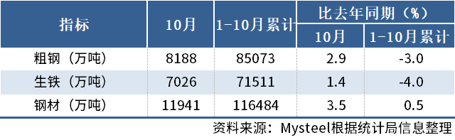 1-10月,中国粗钢产量85073万吨,同比下降3.0%;生铁产量71511万吨,同比下降4.0%;钢材产量116484万吨,同比增长0.5%。