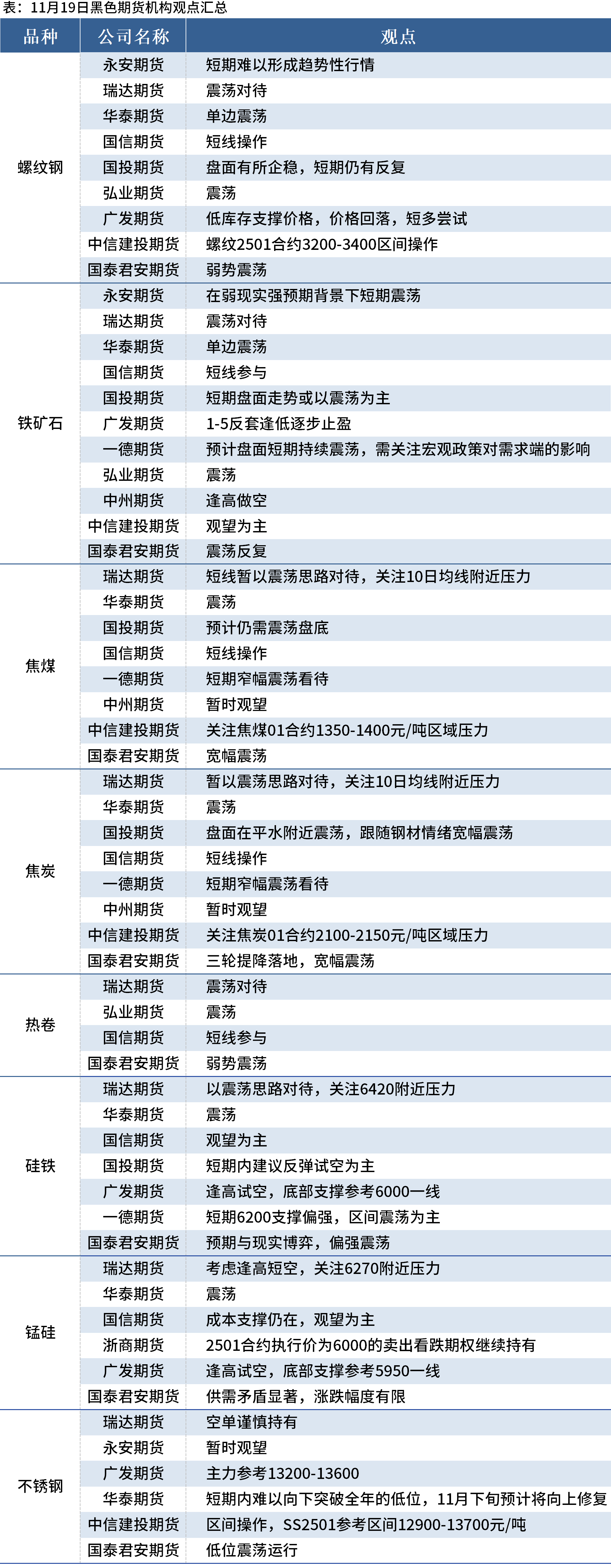 据Mysteel统计11月19日12家期货机构操作策略,其中多数机构料螺纹钢震荡运行,铁矿石震荡运行,双焦震荡运行。具体汇总内容如下: