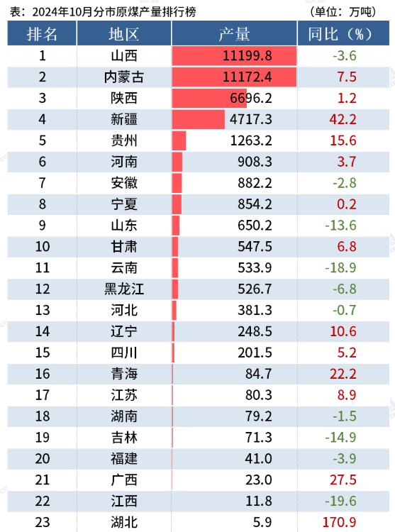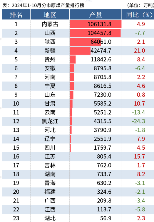 从分省数据来看,1-10月内蒙古、陕西和新疆原煤产量累计同比分别增长4.9%、2.1%和21.0%;山西原煤产量累计同比下降7.7%。