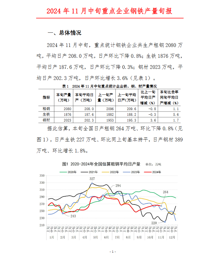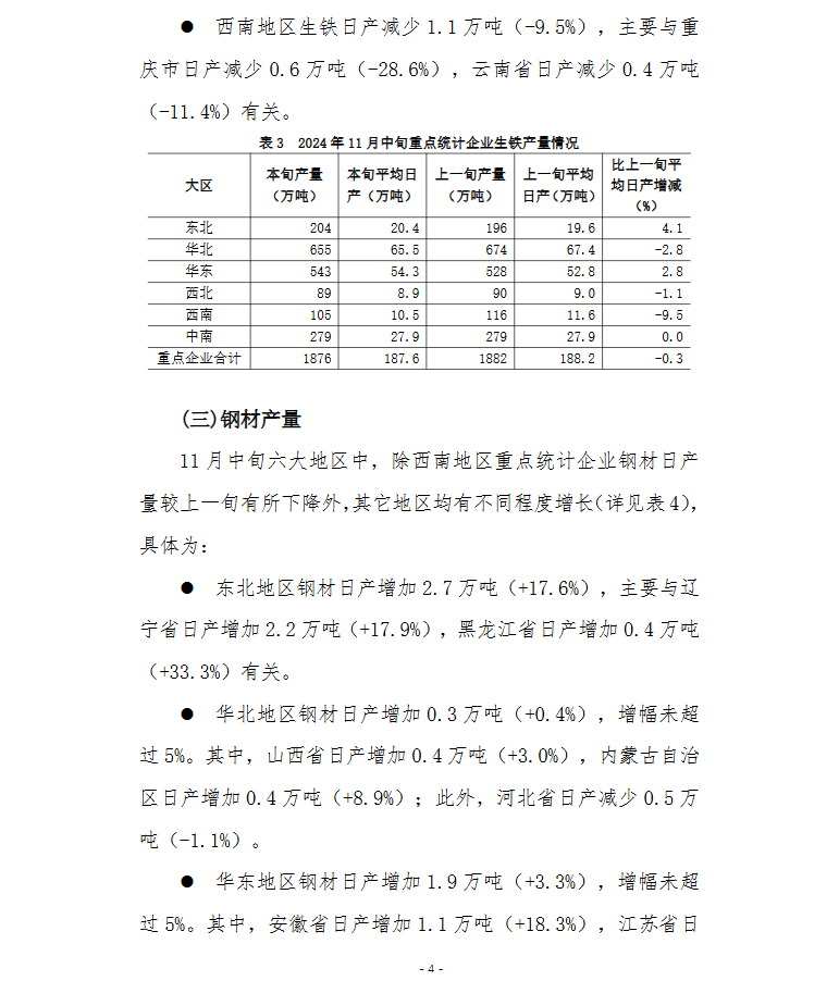 中钢协数据显示,2024年11月中旬,重点统计钢铁企业共生产粗钢2080万吨,平均日产208.0万吨,日产环比下降0.8%;生铁1876万吨,平均日产187.6万吨,日产环比下降0.3%;钢材2023万吨,平均日产202.3万吨,日产环比增长3.6%。