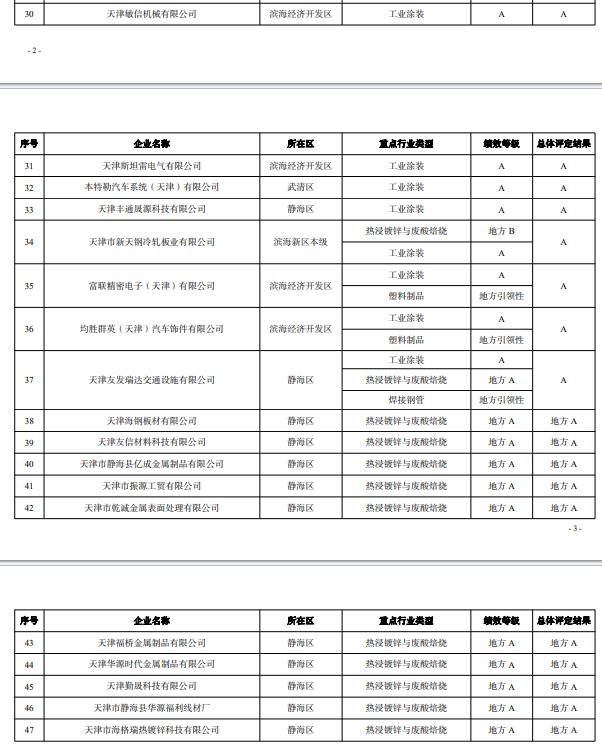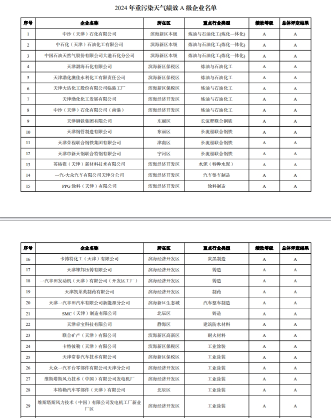 为进一步突出精准治污、科学治污、依法治污,积极应对重污染天气,按照生态环境部《重污染天气重点行业应急减排措施制定技术指南(2020年修订版)》和《天津市典型行业重污染天气绩效分级制定技术指南(2024年版)》相关要求,本着公平、公正、公开的原则,我局组织开展2024年第二、三季度的绩效评级工作。经企业自评、资料审核、现场核查、会议研究后,最终认定A级企业47家、B级企业212家、引领性企业100家。