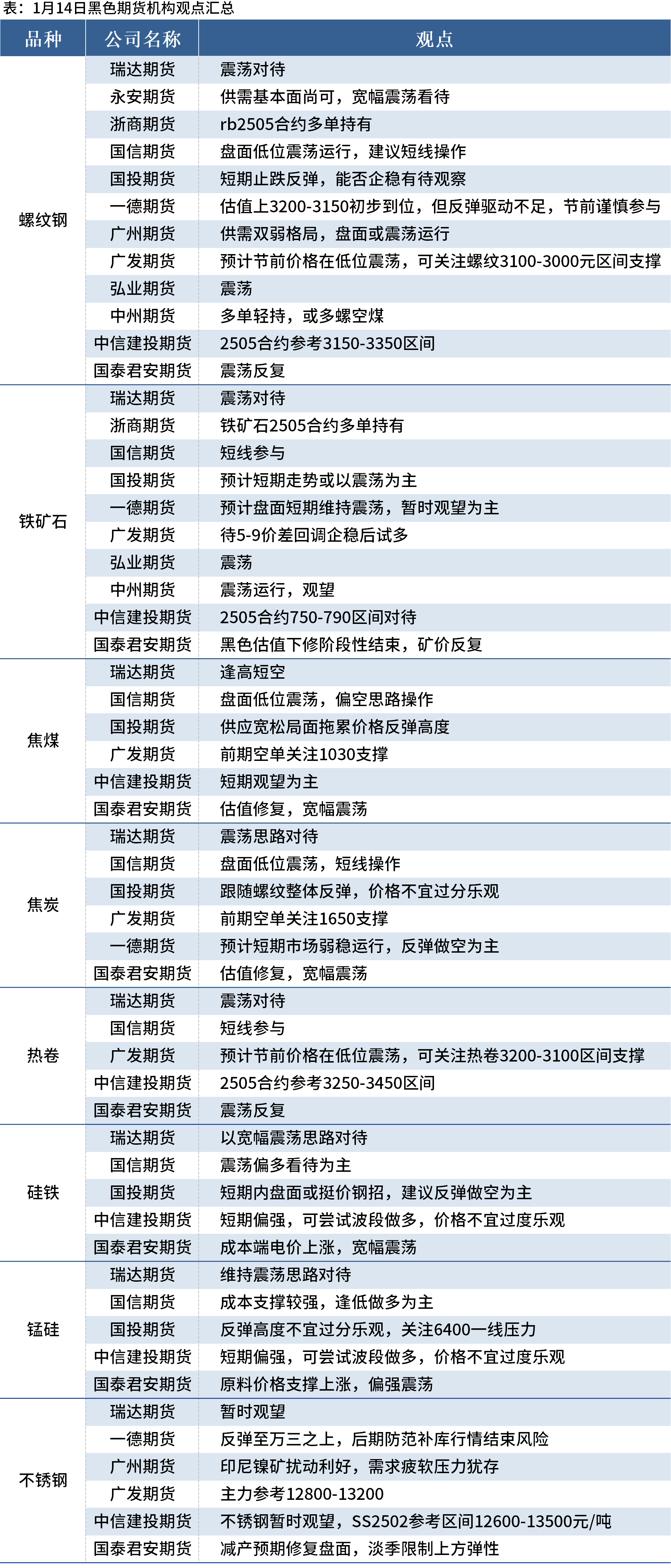据Mysteel统计1月14日12家期货机构操作策略,其中多数机构料螺纹钢震荡运行,铁矿石震荡运行,双焦震荡运行。具体汇总内容如下: