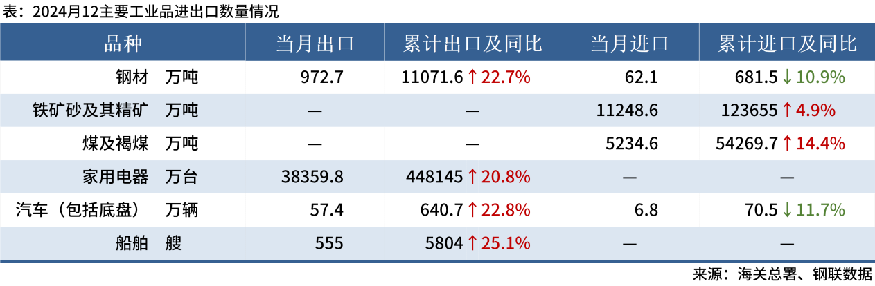 热点:海关总署数据显示,2024年12月中国出口钢材972.7万吨,较上月增加44.9万吨,环比增长4.8%;1-12月累计出口钢材11071.6万吨,同比增长22.7%,创9年新高。其他主要品种进出口情况: