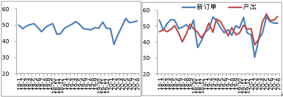 河北钢铁行业PMI走势图 河北钢厂新订单和产出指数