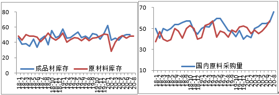8月份的原材料库存指数为48.0%,环比持平。据Mysteel的调查显示,7月底全国样本钢厂的焦煤库存763万吨,较7月底下降14万吨。8月底全国样本钢厂的焦炭库存471吨,较7月底下降30万吨。8月底全国64家样本钢厂的进口矿烧结粉矿总库1670万吨,较7月底上升1万吨。