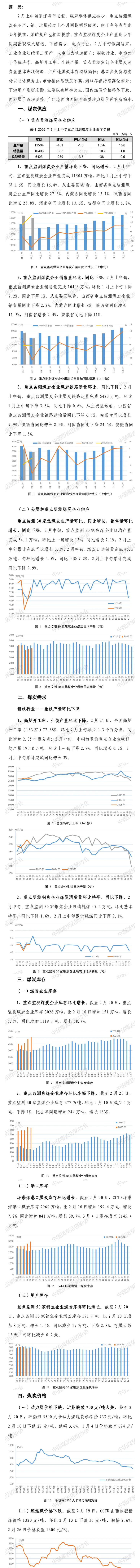 2月上中旬适逢春节长假,煤炭整体供应减少,重点监测煤炭企业产、销、运量较之上个月同期明显回落;由于今年春节比去年提前,煤矿复产也相应提前,重点监测煤炭企业产量比去年同期出现较大增幅。