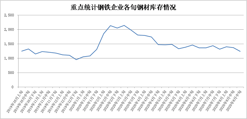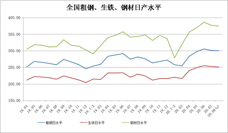 2020年8月下旬,重点统计钢铁企业共生产粗钢2376.22万吨、生铁2118.52万吨、钢材2412.99万吨、焦炭357.01万吨。本旬平均日产,粗钢216.02万吨,环比减少0.04%、同比增长7.16%;生铁192.59万吨,环比增长1.03%、同比增长6.20%;钢材219.36万吨,环比增长6.08%、同比增长10.04%。