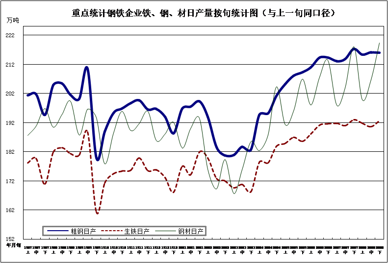 本月重点统计钢铁企业累计平均日产粗钢214.83万吨,环比减少0.03%、同比增长5.40%;生铁191.68万吨,环比减少0.15%、同比增长5.75%;钢材209.03万吨,环比增长0.92%、同比增长7.14%。