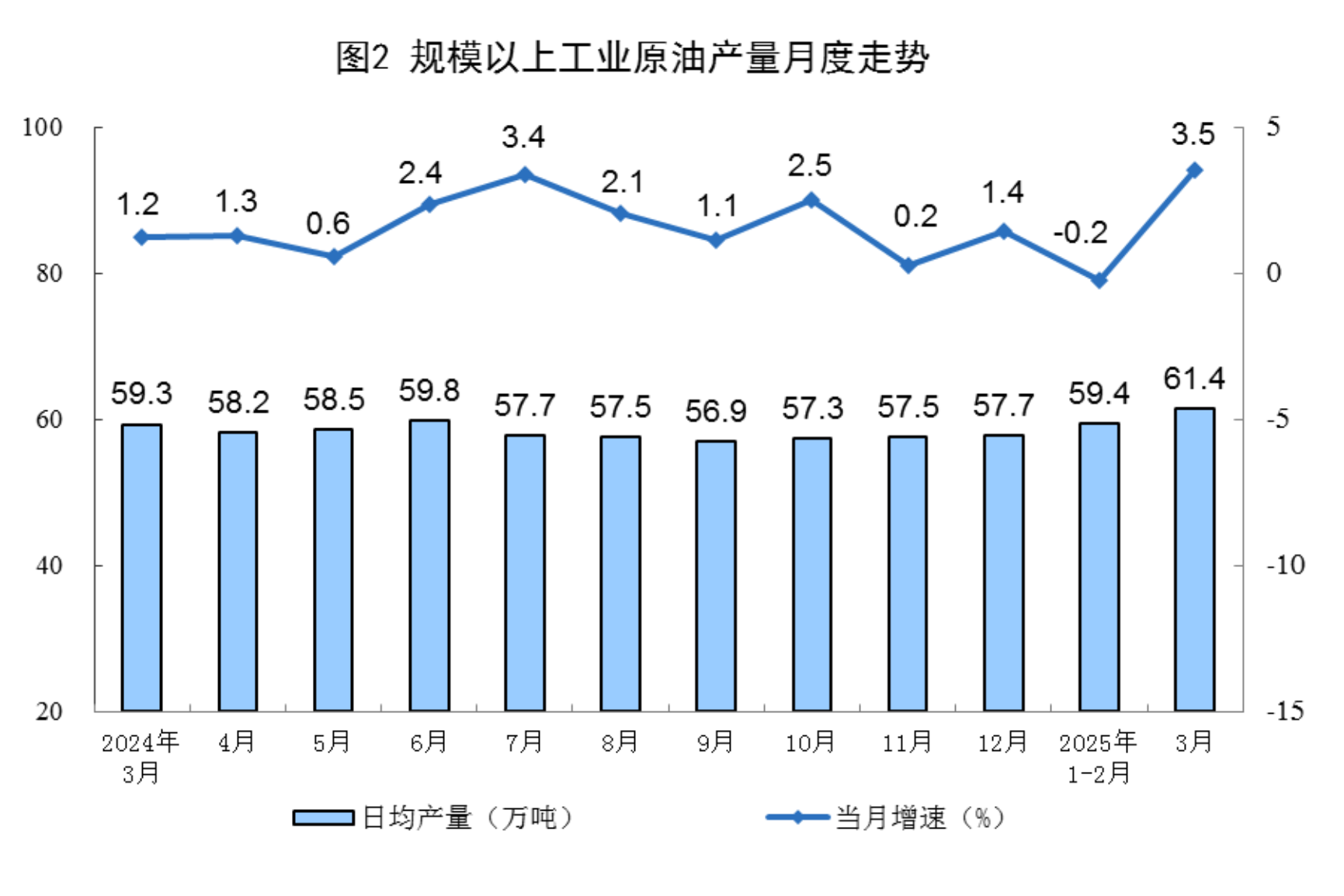 原油生产由降转增。3月份,规上工业原油产量1903万吨,同比增长3.5%,1—2月份为下降0.2%;日均产量61.4万吨。