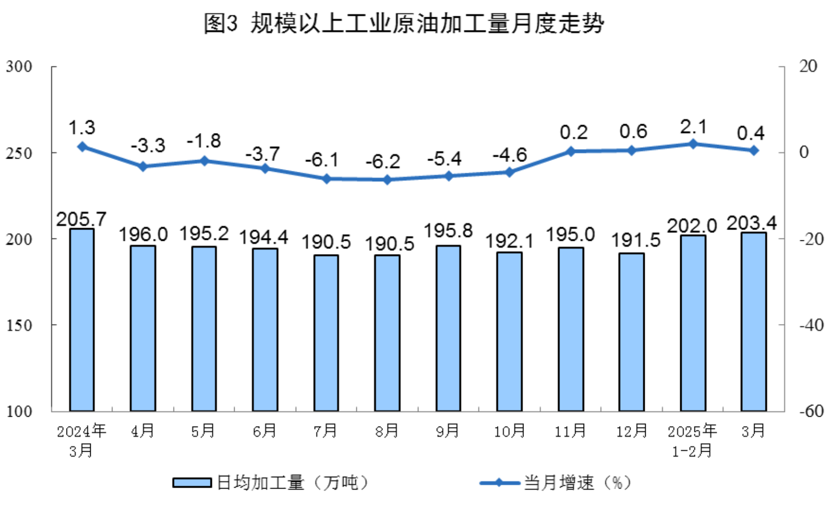 原油加工同比增长。3月份,规上工业加工原油6306万吨,同比增长0.4%;日均加工203.4万吨。1—3月份,规上工业加工原油18225万吨,同比增长1.6%。