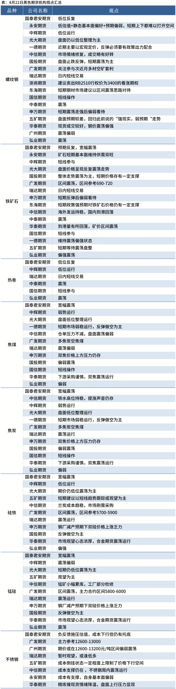 据Mysteel统计4月22日18家期货机构操作策略,其中多数机构料螺纹钢震荡运行,铁矿石震荡运行,焦煤、焦炭震荡偏弱。具体汇总内容如下: