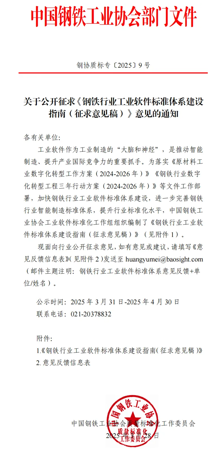 中钢协公开征求《钢铁行业工业软件标准体系建设指南(征求意见稿)》意见