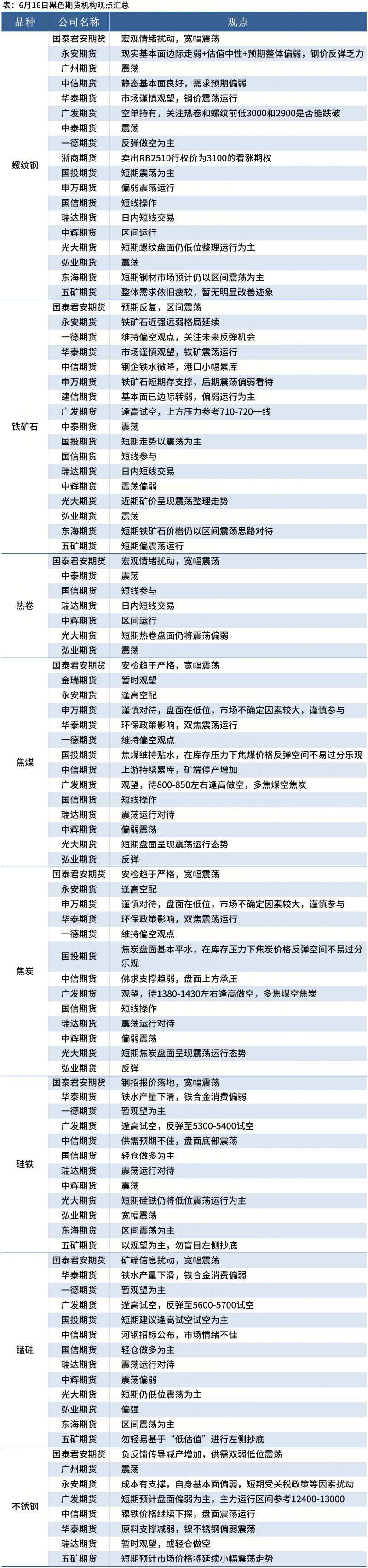 据Mysteel统计6月16日20家期货机构操作策略,其中多数机构料螺纹钢震荡运行,铁矿石震荡运行,焦煤、焦炭震荡运行。具体汇总内容如下: