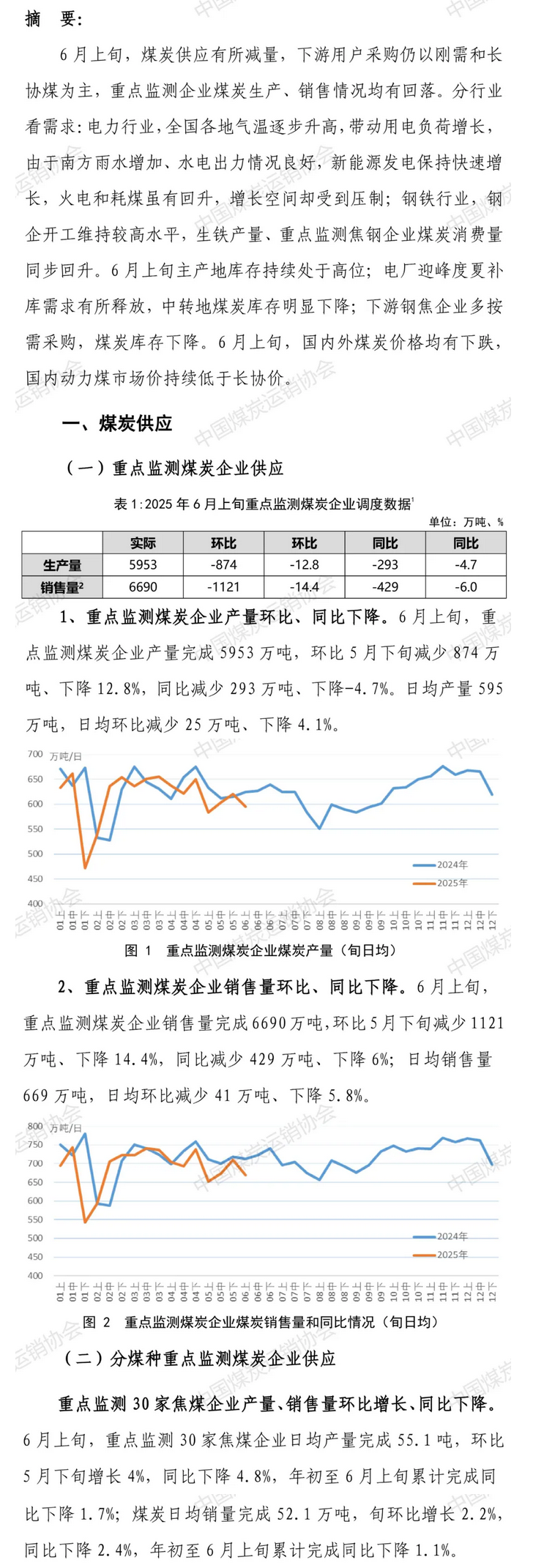 据中国煤炭运销协会消息,6月上旬,重点监测煤炭企业销售量完成6690万吨,环比5月下旬减少1121万吨、下降14.4%,同比减少 429万吨、下降6%;日均销售量669万吨,日均环比减少41万吨、下降5.8%。