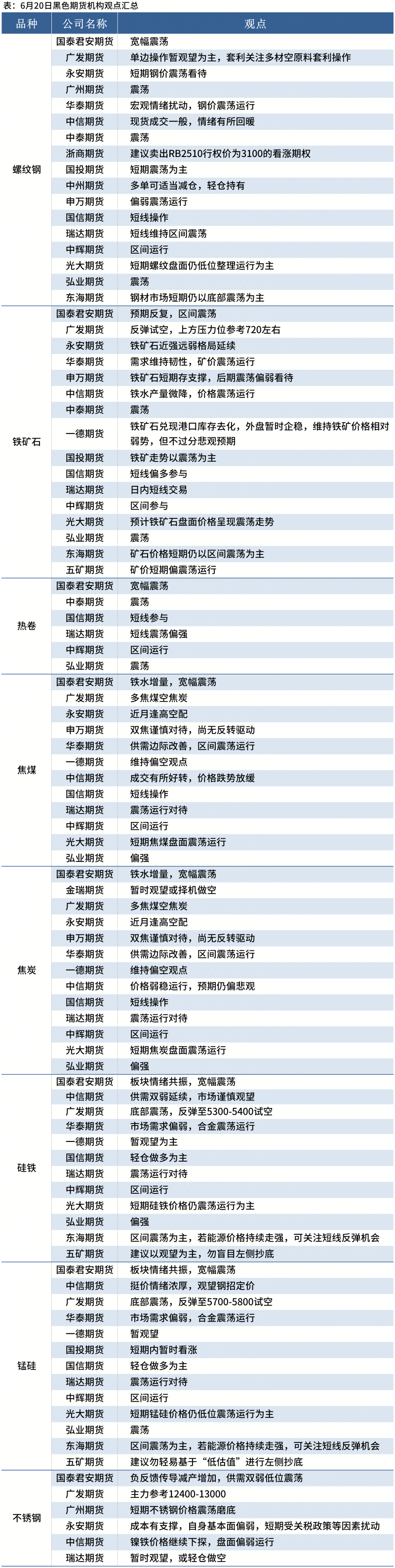 据Mysteel统计6月20日20家期货机构操作策略,其中多数机构料螺纹钢震荡运行,铁矿石震荡运行,焦煤、焦炭震荡运行。具体汇总内容如下: