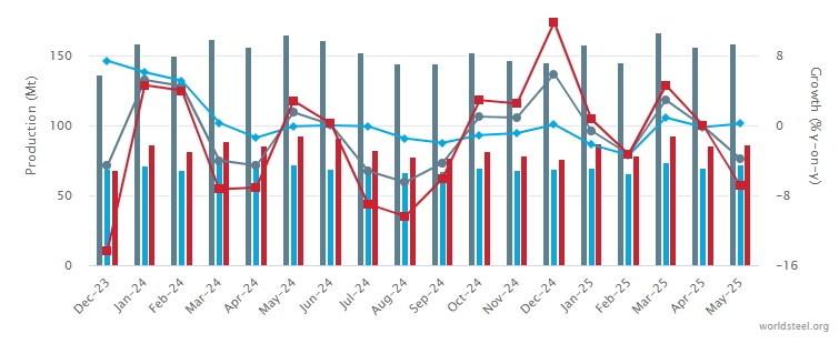 2025年5月全球70个纳入世界钢铁协会统计国家/地区的粗钢产量为1.588亿吨,同比下降3.8%。