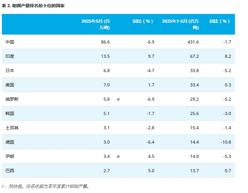 2025年5月,中国粗钢产量为8655万吨,同比下降6.9%;印度粗钢产量为1350万吨,同比提高9.7%;日本粗钢产量为680万吨,同比下降4.7%;美国粗钢产量为700万吨,同比提高1.7%;俄罗斯粗钢预估产量为580万吨,同比下降6.9%;韩国粗钢产量为510万吨,同比下降1.7%;土耳其粗钢产量为310万吨,同比下降2.8%;德国粗钢产量为300万吨,同比下降6.4%;伊朗粗钢预估产量为340万吨,同比提高4.5%;巴西粗钢产量为270万吨,同比提高5.0%。