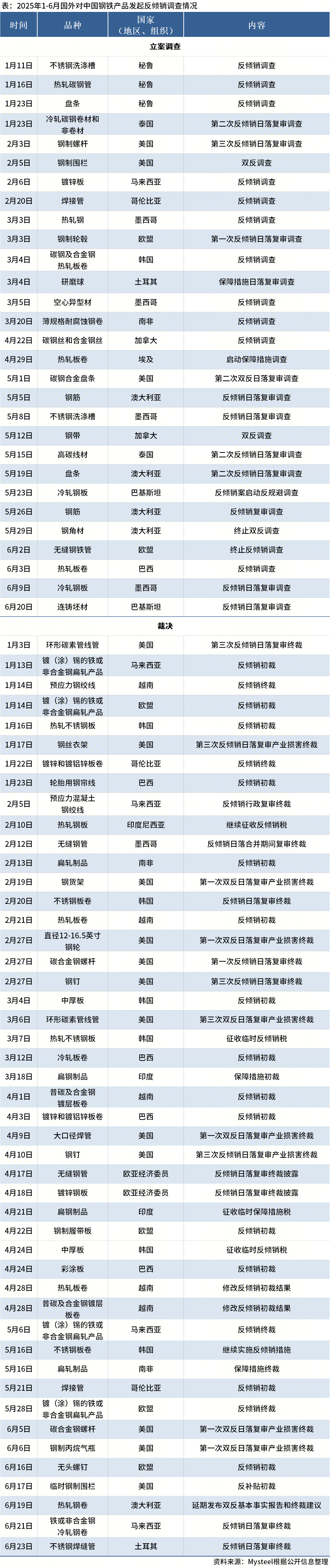 据Mysteel不完全统计,2025年1-6月中国贸易救济信息网陆续公布超70起国外对中国钢铁产品发起的反倾销、反补贴调查或裁决。涉案品种包括大口径焊管、彩涂板、不锈钢洗涤槽、热轧碳钢管、盘条、镀锌板、热轧钢、环形碳素管线管、预应力钢绞线、热轧不锈钢板、钢筋、钢带、无缝钢管、不锈钢板卷、中厚板、不锈钢焊缝管、连铸坯材、扁钢制品、镀(涂)锡的铁或非合金钢扁轧产品等。具体如下: