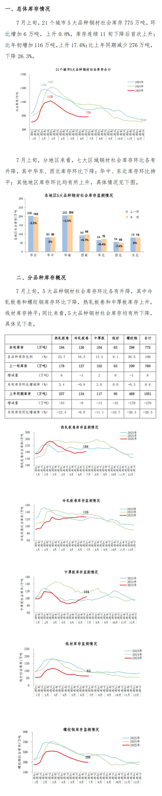 摘要:中钢协:7月上旬钢材社会库存775万吨